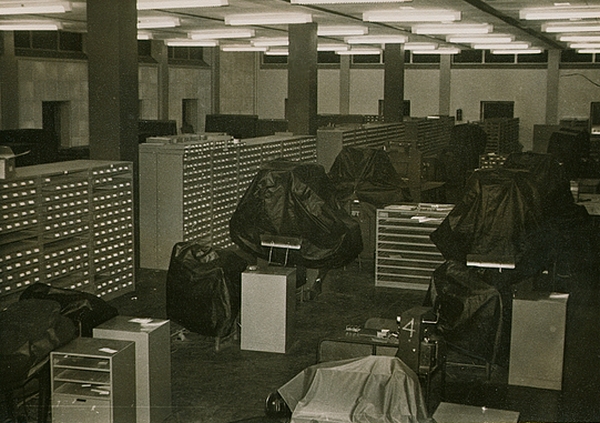 I spent some of that time undergoing training at ICT's main factory in Croydon, but the rest was idled away testing our new machines. Strangely our presence seemingly was not to be needed elsewhere by the Company during the interim period. Eventually contractors began work and a slightly raised floor was installed to permit the fitting of many brass powerpoints distributed over the area and finally a covering of very thick blue civil service linoleum was laid. Large banks of filing racks were installed down the centre of the room and then we were able finally to position the machines to the Post Office plan and retest them.