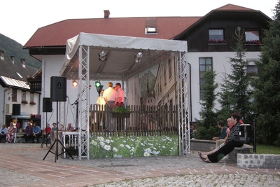 On that Saturday evening, after our evening meal we ambled down the few hundred yards to the central square of Kranjska Gora where a village entertainment in the form of Slovenian folk songs was in progress. Each evening of the week a free musical event took place here, ranging from folk songs via a zither fest to a night of jazz. Kranjska Gora is either a large village or a very small town. Half of its buildings are hotels or have some connection with the tourist industry, it being Slovenia's main ski centre. Slovenia is well into that sport having the world's highest ski jump and is a manufacturer and exporter of quality skis. In the village we found a good sized supermarket, a church, a school, a selection of small shops including a fruit shop, an ice cream parlour, a casino and a petrol station. The following morning we also found that the church serves its purpose in preventing the sin of sloth by an extended pealing of its bell which causes the whole village to awake at seven o'clock.