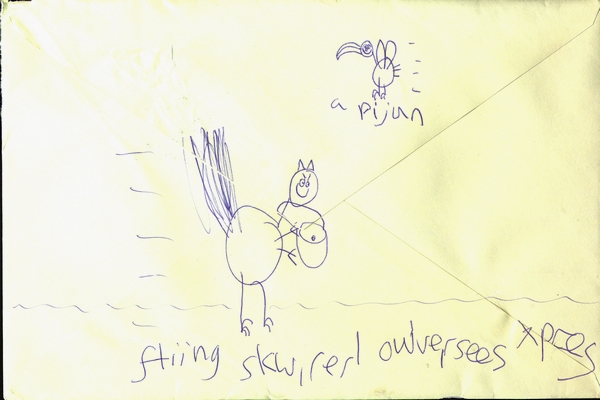 Here it is believed that we are seeing a representation of Mercury, the winged messenger. The significance of the smaller bird is not clear but could it have been in Nicholas's mind that it was on its way to add to the foul deposits at the Grime Factory? However what is quite clear is that water is being crossed : is it the Bristol Channel or the Solent, or possibly even the Styx? His work frequently contains text, usually with similar wording to this one. Perhaps this should not be taken at face value : could there not be some encrypted meaning of greater significance? Also we do not know the nature of the message which Mercury is carrying in his satchel - he wears a fiendish but enigmatic smirk so it could be either sad or good news, news of the outbreak of war or news of peace.But it just could be something as mundane as a missive from the Inland Revenue or perhaps a gas bill. Or perhaps even a birthday card. So much information conveyed by so few strokes of the pen and those are undoubtedly of inverse proportion to the true import of the work! Brevity of style does little to eliminate conjecture so no doubt many long hours will be spent by those who believe that they can see into an artist's mind, burning much midnight oil in determination of the true meaning of whatever it is that may lie hidden here to us lesser mortals.
